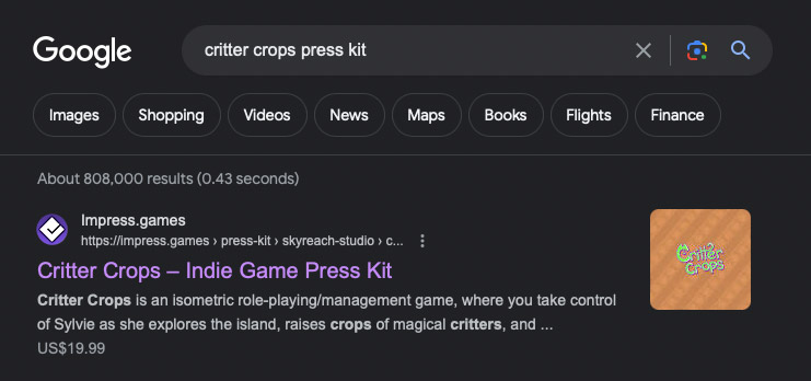 So what happens? They Google: ‘your game name’ press kit. If they don’t find what they’re looking for, they’ll take some screenshots from Steam, or worse, take some out-of-date assets from Google Images. (Or even… Bing. *shudder*)